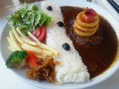長井ダムカレーは写真のハンバーグスタイルと、果物と野菜をトッピングした本年の春バージョンがあります。ダム(ご飯)の左側は共通。意外とボリュームがあります。ワンドリンク付きというのは気が利いてます。ホテルに入っているカフェレストランが企画していることもあり、全体的に上品。子供が食べることを前提としており、甘口です。