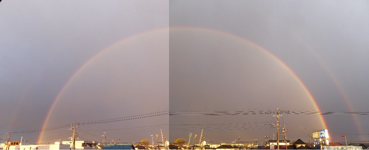 うーむ、こんな完璧な虹は久しぶりだわ。 二重の虹で外側も完全な弧を描いてましたの(さすがにコンデジでは写らなかったー) 鼠色の雲をバックに色鮮やかな虹って・・・絵的に結構不気味ね。