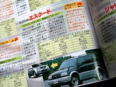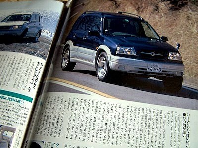 TD62Wを主体とする2代目エスクードが紹介された昔の雑誌で、かいつまんで言うと見出しの通り「コーナリングはいいけど乗り心地が固い」という評価がありました。62Wのグリルが初期のハニカムデザインなので、2代目にV6‐2500が追加された98年2月以降、まだ2代目が初期型の頃の記事です。
