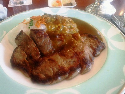などという漫画のギャグが通じる世代ではないので、得意のぬい撮りはほっとくのですが、昔東京で食ったステーキ乗せカレーと比べると、ずいぶん上品な調理の肉です。ジャガイモの冷静ポタージュスープも上品。ただひとつ、カレーだけが下地から作っていない工場生産ものだというのが残念。しかし僕だけがこの酸味を嫌っているのかも。