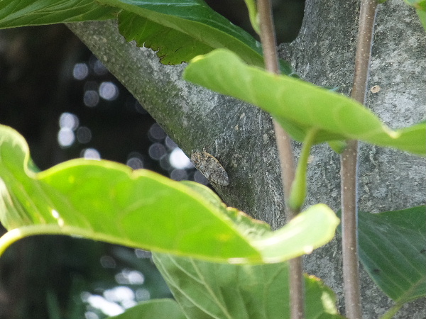 道沿いのお宅の庭木に、びっしり(笑)止まってたアブラゼミの中に一匹だけサイズの違うセミがいたので撮ったんだけど・・・