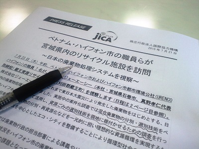 国際協力機構(JICA)の案内が入ってきて、機構が技術や政策支援協力をしているベトナムのハイフォン市から、科学技術や天然資源環境、建設などの担当役人が来日して宮城県庁やら仙台市やら民間工場やらの視察をするからよろしくね。と書かれていて、よくよく見たらこの民間工場というのが6月に見学させていただいたJAC蔵王資源リサイクル工場でした。そういえば真野社長、昨年はベトナム出張が続いていたなと思い出しましたが、リサイクル技術の提供だったようです。