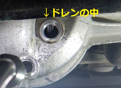 ホース3渡辺代表がなぜ、デフオイル交換の前にこんなことを始めたかというと、アクチュエータ側のホースがフロントデフの中を通っており、目視点検のためなのか設計上そうなってしまったのか、ドレン穴の中、真正面に来ているのでした。