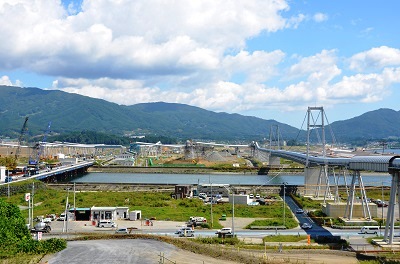 川と国道をまたいで、陸前高田市の被災地に対岸の山を切り崩して土砂を運んでいたベルトコンベアが、その運搬作業を完了させ、解体工事が始まりました。去年の3月末から行われてきた土砂の運搬は、総量で約500万トンにものぼったそうです。