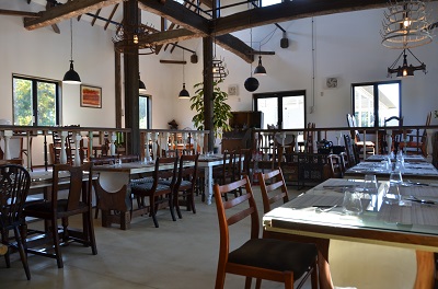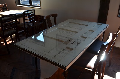 あれっ? 鵜呑みにして聞いていたから、どこがどうComterraなのかわからん(だめじゃん)。それでも、どれくらい「無駄のない」というテーマを具現化したかというと、レストラン棟そのものが、リサイクルとリユースを合わせて80%の再生利用率なのだそうです。ふと気が付いてセッティング中のテーブルからクロスをどけてもらったら、ガラス板の下はドアだったり窓だったりします。テーブルの脚なんか、「臼」を割って使っているものがあります。