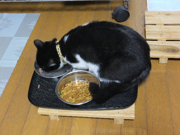 (婆にゃのぐぁんは缶詰とカリカリのお皿を分けてます)