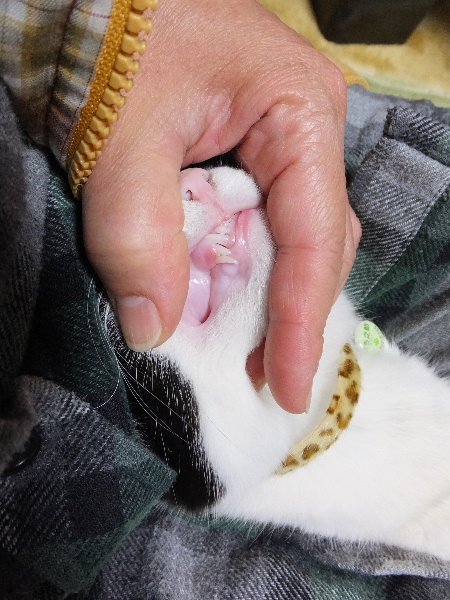 とっくに牙が生え変わったでんに対して、まだ乳歯が抜けないいちは二枚刃状態。2日前にやっと片方抜けました。