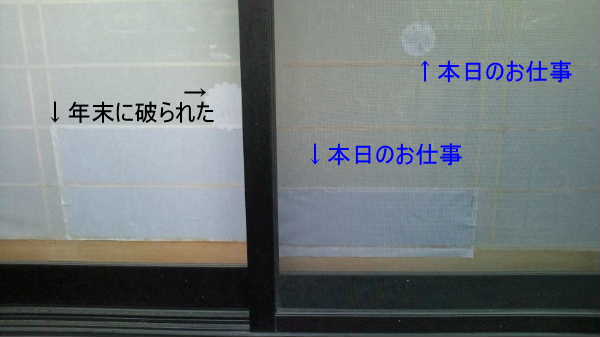 午後。洗濯物を取り込みに帰ると、和室の障子に穴(泣)