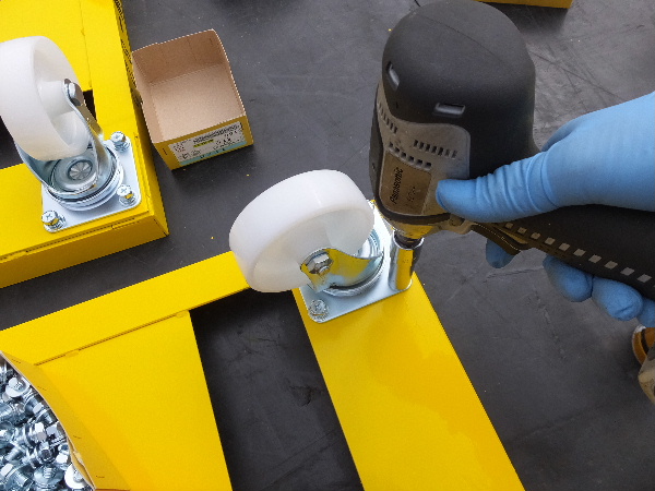 新月サンのお手伝いで、鉄製台車のキャスター付け。 1台に付16本のボルト締めました(×50台)