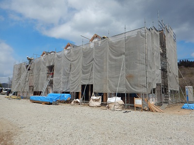 この工場よりもちょっとだけ高台に整備されているのが、以前も書いているリサイクルパークのjack’sVillageで、レストラン棟の隣に二階建ての建物が姿を現しています。四月下旬のゴールデンウイークにオープン予定のショップ棟だそうです。雑貨コーナーの入った小さな建物はすでにあるのだけれど、ここでどんなものが販売されるのかはまだ公にされていません。