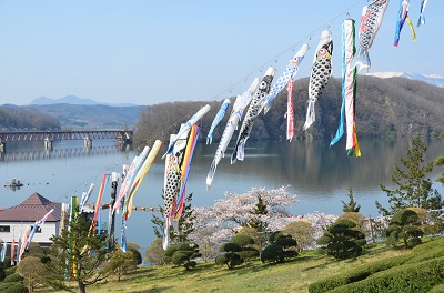 こちらはどうにかこうにか光がさしてきたところで撮るものを撮って撤収。釜房ダム管理所の近くに戻ると、こいのぼりが掲揚されておりましたよ。