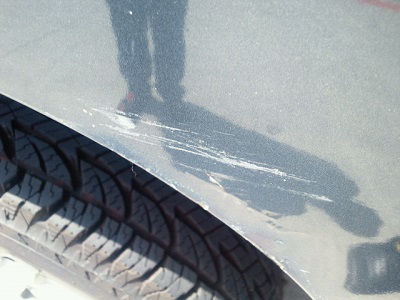 まさかのぷらすBLUEの故障?・・・は、ほぼ間違いなくO2センサの動作不良なので静観しつつ、ふと見たら8年くらい前に家内のクルマにぶつけられた右リアフェンダーの破損個所が塗装に亀裂まで入り始めていました。