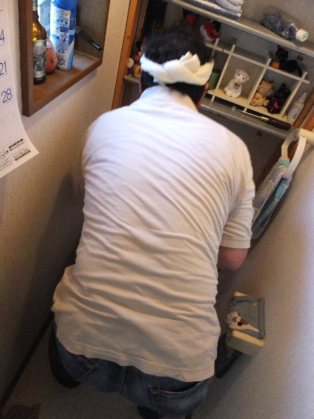 必要最低限のスペースしかない狭いトイレで便座外したり配管外したり、新月サン悪戦苦闘。
