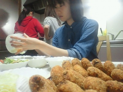 コロッケづくりとなると一家総出(うそ。約1名戦力外)。ジャガイモ蒸しとひき肉の下ごしらえ、こねて整形、揚げる担当、絶妙のチームワークです。