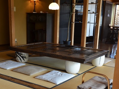 古民家・・・というほど古くはない民家を改装したカフェを見つけて、店内で目にしたのがこのテーブル。長屋門の通用口か何かであった扉でしょうか。