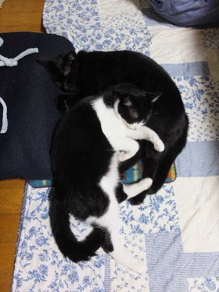 猫ずのトイレ掃除&ご飯の支度を済ませてからクーラーをつけたら、座椅子にもたれかかって(なぜか乗りはしない)寝る二匹。