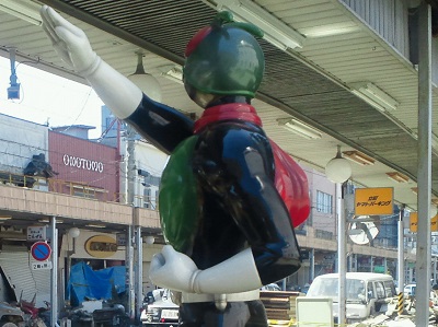 津波から二週間後、ようやく足を踏み入れることのできた石巻の町は、その年の2月に訪ねたときの記憶と照合するほど言葉を無くしました。風のない埃とヘドロ臭の立ち込めた町なかに立つヒーローの立像よりも、その近くで勝気に笑いながら炊き出しのように肉を焼いて振る舞っていた青年たちの方が、掛け値なしに勇者の背中を思わせた5年前。この仮面ライダーを撮影することそのものに後ろめたさを感じながらも、当時の心境はこんなで、書き留めずにはいられませんでした。