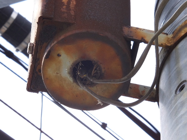 珍しくも歩いて近所をうろついていたとき、頭上から 『チチチ・・・』と雛スズメの声が。 しかし、そこって道の端。 スズメって普通家の軒下とか戸袋の中とかに巣つくるよねぇ???と思いながらキョロキョロしてたら、電柱に付いてる街灯の下に親スズメ。 よく見たら開いている穴から黄色い嘴が二つ三つ。