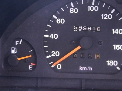 燃費と航続距離は一対のものですが、リッター何キロを語るよりもどこまで走れるかを語った方が楽しいので、この600キロを走れるのかどうかがうちの課題の一つです。以前テストを行ったときは、車高は上げたけれどタイヤはノーマル規格でした。現在はタイヤの大径化とラジアル→オールテレーン変更も行われていて、カタログ燃費はまともに出せません。が、たまには条件をうまいこと満たしてこの写真のような状況で給油に至ることもあります。