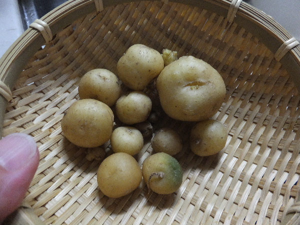 まーさか芋にはなってないだろうなぁ・・・と思いながら、プランターの土に手を突っ込んだら、ナニか手ごたえが。 チラリと写ってる爪と比べれば、どんだけ小さいかお分かり?皮むいたら食べるトコなさそうなので、このまま茹でようかと。