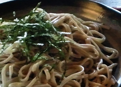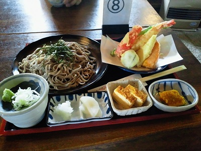 執着が無いとか強がり言ってる割には、そこで小西食堂には戻れず(戻りゃいいじゃん)、そういえばもう少し先に何年か前から古民家を移築した蕎麦屋ができていたなあと、そのお店「ふじ田」に初めて立ち寄ってみました。並ぶことはないものの満席で大テーブルに相席という賑わい。でもってついいつものパターンで天ざる、と告げたらもちろんそれで通りはしましたが、この店の冷たいやつは「陶器の皿」に載ってくるのでした。水切りに自信があるってことなのかどうか、素人には判りませんが瑞々しくてのど越しの良い蕎麦です。