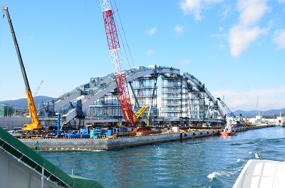 汽船の役目は終わるものの、観光船は残るという話で、気仙沼湾の湾というか入り江というかの風景を海から眺めることは続けられるようです。今、湾ではその大島架橋となる「鶴亀大橋」の組み立てが進んでいて、大きなアーチを観ることができます。が、これも今のうちの風景で、来年の3月には橋の架かる場所に曳航され据え付けられてしまいます。橋と道路はさらに次の年の開通予定だとか。