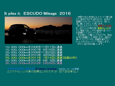 2016年のエスクードマイレッジも残すところ2週間ほどで切り替えとなります。宇宙的スケールでは牛歩のようでも、年間約100万キロくらい距離が伸び続けていることは、それだけ歴代のエスクードが元気に走り続けてくれている証です。この企画も10年、そのことにも感謝しております。