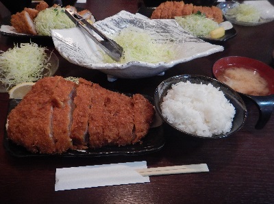 中指対小指だと、どのくらい違うのか。そこはお客の身勝手で比べたくなります。カツに使っているのは奥久慈ポーク(引用サイトの解説にある山方町は、現在は常陸大宮市)。と、言われてもよくわかりません。茨城産の豚肉と言えばローズポークくらいの知識しかなかったので、たぶんこれまで食ったことはないのだと思われます。家内がヒレカツ、僕がロースかつ、霙が一口ヒレカツの各定食を注文。まず千キャベツが別に出てきます。カツにもキャベツはついてきたので、ソース以外のドレッシングで味わえるという親切さがありがたいです。