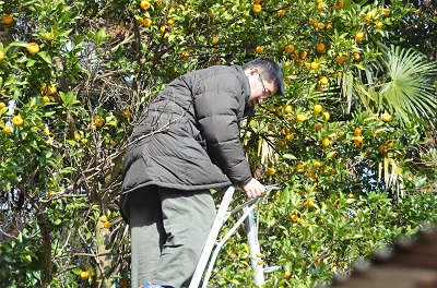 祖父母は福来みかんの皮を乾燥させて七味唐辛子の材料にしていました。みかんそのものは酸味が強烈なので、それを好む人でないときつかろうなと思います。そのへんの都合は関係なしとして、狼駄さんによるみかん狩り。彼曰く