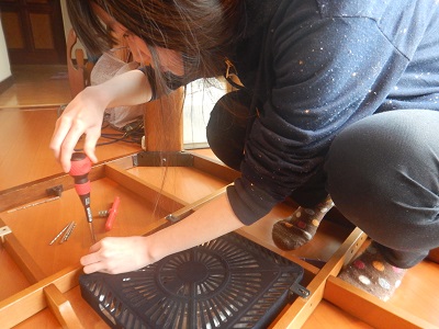 これはいかんと家電店にヒーター部分を買に行ってきましたが、今度はフレームとヒーターを固定するねじ穴の位置がまったく合わない。取り外したヒーターの補助ステーを介して新たにねじ穴を切るしかないなと考えていたら、霙は同じことを思いついたらしく
