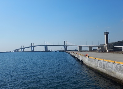 が、この橋は小名浜港に陸揚げされる石炭を運搬するための作業用道路のため、我々一般人は通行できません。橋の向こうでは専用桟橋と護岸で覆われた人工島が建設されており、完成後はそこに輸入された石炭がストックされるのです。我々は水族館アクアマリンふくしまあたりからこの景色を眺め、ライトアップで浮かび上がる様子を楽しむこととなります。