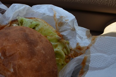 虹の松原は百万本と言われる松林で、またもや「日本三大」の松原のひとつ。その街道上に突如現れるマイクロバスとテントという店構えのバーガーショップは、松原散策と海岸へ出る人のための自由駐車場にあり、すでに満車ですが、TJさんは巧みに空いているスペースを見つけて滑り込みます。いや、俺、エスクードでもそこへは入れない。でも隣のクルマとの間隔はきちんとドアが開くのです。とてもTJ乗り出し一年弱とは思えない。