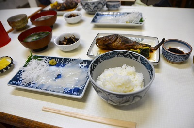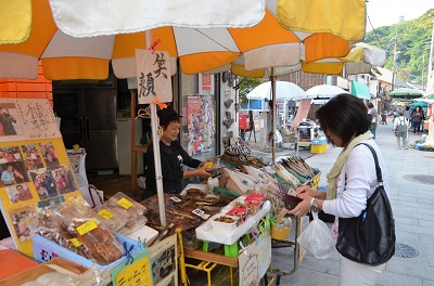 朝市の設営よりも早く到着してしまうほど早朝の福岡前原道路を走ってきたため、町にはまだ観光客もなく、のんびりと内湾の海を眺めてから、ウエストウインの面々に頼まれ一夜干しやら干物やらを買い出しするTJさん。「一夜干しもするめも美味いけれどやっぱりイカ刺しですよ」と、朝市通りのなかにある食堂でメバルの煮つけと一緒に出てくる定食のイカ刺しをいただきます。2時間前に仕入れたイカだとか。