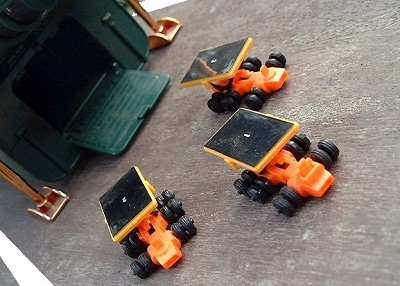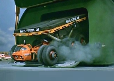 ところがですよ。玩具ではちゃんと3台収まっていたからスケール的な疑問を持たずに過ごしていたのですが、この搬出シーンを見ると、車両としてはかなり大きい。こんなのほんとに4台も搭載できるのか? ポッドの鉛直方向、左右に立てかけでもしないと格納しきれないような気がします(Thunderbird are Goではポッド内で組み立て式の超小型になってましたが)。先駆者がこうなんですから、マグマライザーとホーク3号のことはもう不問にしちゃってもいいでしょうねえ。