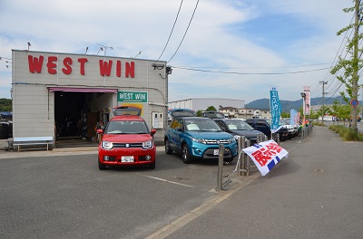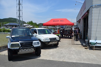 暑いながらも海からの風が程よく届いていた週末。スズキ自販福岡の車両提供による試乗展示会と、チーム・ウエストウインが保有する2台のダートトライアル用エスクードの展示を軸に、スズキエスクードミーティングが開かれました。三代目エスクードから四代目へと乗り換えのための商談に訪れる人、イグニスの試乗に来店される人、四代目エスクードを試乗する人などなど、ウエストウインの日常の延長といえばそのままです。