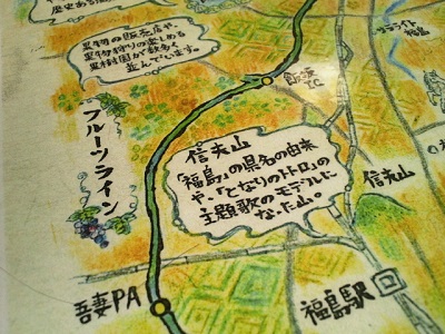 そのうまいトンカツを食っていたら、国見周辺のガイドマップが目に入ってきて、なんとなく眺めていると、福島市内の信夫山は「となりのトトロ」の主題歌と縁があるというガイダンスが書かれていて「へー」と思って店員さんに聞いてみたら、作詞をした人が幼少時代に過ごしたところなのだとか。知りませんでした。が、福島市民にとっては有名な逸話だそうで、狭山丘陵を知らなくても信夫山とその主題歌「さんぽ」の関係はひとつの拠りどころのようです。街なかにぽつんと所在する信夫山って、ある種巨大な塚森という風情もあるしね。