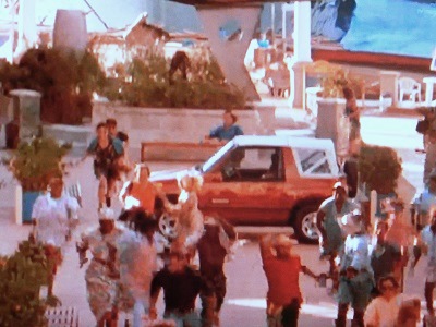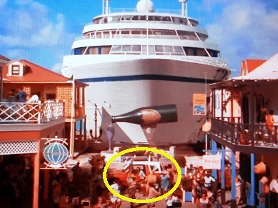 このシーンは「SPEED2」ラスト直前に忽然と置かれているビターラコンバーチブル(場所がカリブ海の港町なのでビターラでしょう)の姿なんですが、向こう側にでっかいボトルのオブジェが飾られており、その先にはプレジャーボート用の桟橋が続いていて、そこに大型クルーズ船が突っ込んでくるという場面です。