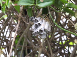 申し訳ないので、元あったらしい辺りに針金で括り付けて様子見。しばらくしたら逃げたらしいもう一匹も(巣が小さいので成虫がまだ二匹しかいなかった)戻ってきたので大丈夫かな。