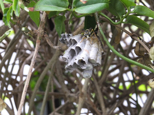 モコモコとフェンスの内側に繁茂している羽衣ジャスミンの蔓をバシバシ切っていたら。切り落とした蔓の山にちょこんとアシナガバチの巣が・・・