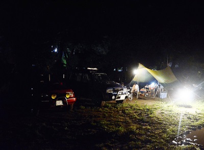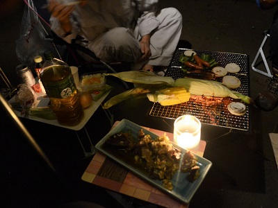 とりあえず晩餐は魚づくしでカツオのたたきとイワナの塩焼き・・・だけでは間が持たないじゃんと、焼き物色々でいつものようにエスクード談義です。カツオのたたきについては書き流すのはもったいないので後日あらためて紹介しますが、「そういう考えはなかった!」のE‐ACTらしい出し物でした。雨対策は、もちろん霙に頼んだてるてる結界の威力発揮です。しかも日中25℃と言われていた現地は午後からもう涼しく上着を羽織ってちょうどよく、虫も飛び交わない好条件です。