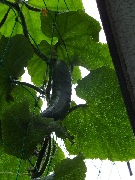 さてさて、にょきにょきベランダまで届きそうに伸びてしまったキュウリ。下からは勿論ベランダからも手が届かないという絶妙な位置に1本(笑)