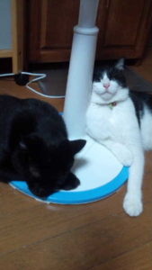 扇風機に寄りかかって寝る二匹。