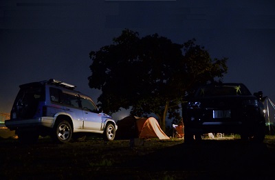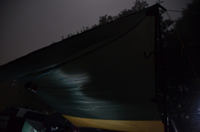 時間を巻き戻して朧月の月齢は16.9。まだ満月から抜け出したばかりの晩。タープ越しでも月光が柔らかく降り注いでいました。だからねー、満月期にはいろんなことが起きるというジンクス発揮でしたね。連休初日だけにサイトも混雑していましたが、多少ぬかるんでいたとはいえ、まあまあ広いゾーンを確保できたので、窮屈にならず騒がしくもなくの設営でした。