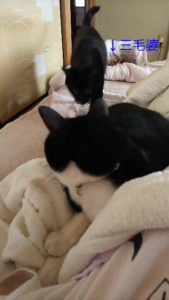 最初はふぅが寝ていたのに、チビずが来たら足もとに避難したった・・・