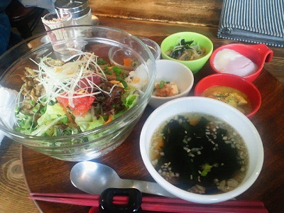 KIMさんが案内してくれた福島県猪苗代町の「おやじカフェ」は、郡山市にある下町情熱食堂焼オヤジの姉妹店なんですが、いろいろおすすめな献立がある中で、おやじ丼を定食で注文するのがよさげです。焼肉丼のようでその焼肉の下に叉焼やらそぼろ肉やらが隠れているし、単品だと温泉卵とスープのみだけれど定食には小鉢が数種類ついてくる。