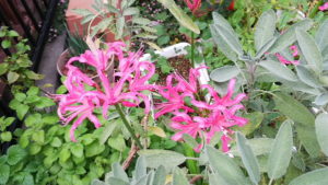 わさわさと伸びたセージ(ハーブ)の陰に埋もれて、枯れてしまったかとひやひやしてたダイヤモンドリリー。 無事に葉が伸びてきたので見守っていたら、蕾ができました。