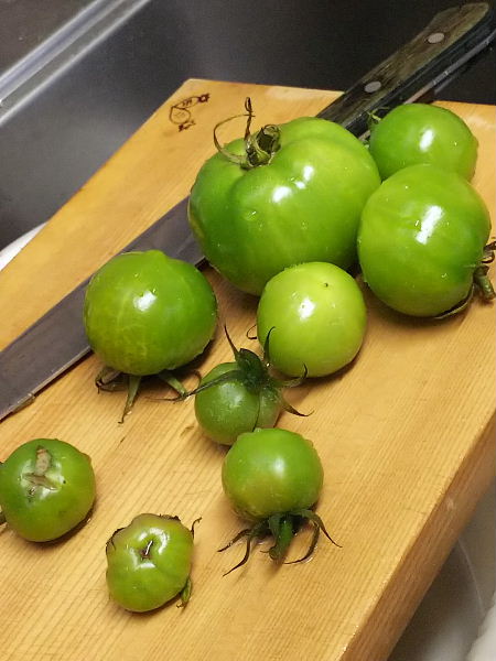 霜に当ててしまったから凍みたトコから腐りそうなので、昔一度作ったグリーントマトソースにしました。