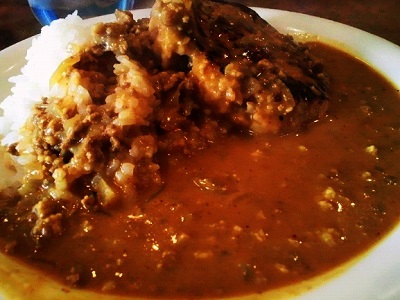焼肉でもトンカツでもオムレツでものっかるらしく、薦められたのはハンバーグ。注文後に手ごねして焼いてくれますが、おい、それかなりでかくない?なサイズ。ちょっとそれデフォルトで大盛り?というライスにそれがのっかり、惜しげもなくキーマカレーがよそられました。