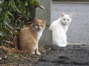 白猫の向こう側に茶白がもう一匹いたのだけど、門扉の奥にさっさと逃げ込まれてしまったわ・・・