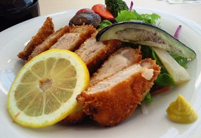 幸いにも滞在時間中は宮城県を出たときよりも晴れ渡った青空に恵まれました。仕事をこなして先方と別れたあとに道の駅に立ち寄り昼飯にトンカツ定食を頼んだら、これはなかなかすごいじゃんというボリュームの料理が現れました。米沢もので、ポークもうまいのだとアピールしていたトンカツは250g。千キャベツではなく地元産の温野菜がふんだんに盛りつけられています。トンカツの下にはオニオンリングのフライがごろごろと隠れていました。野菜風味の汁物も抜群にうまい。